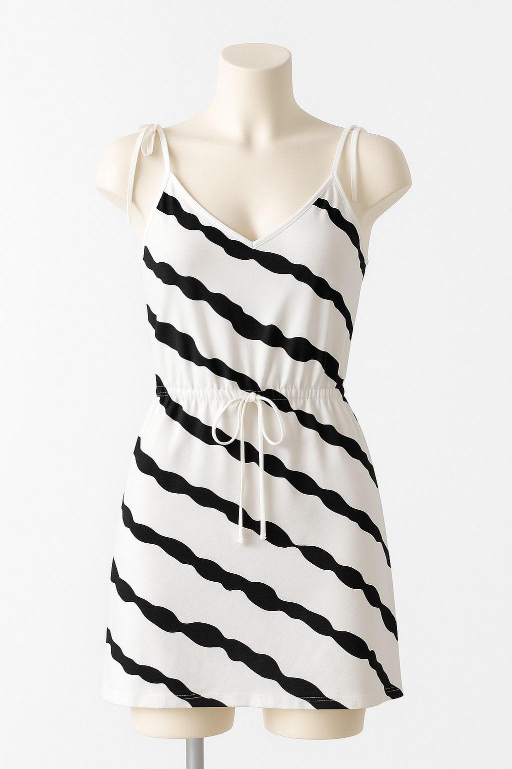Colore e fantasia: fondo bianco con motivo a righe diagonali ondulate nere, dal design moderno e vivace.