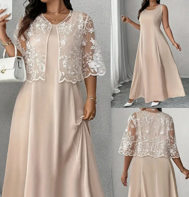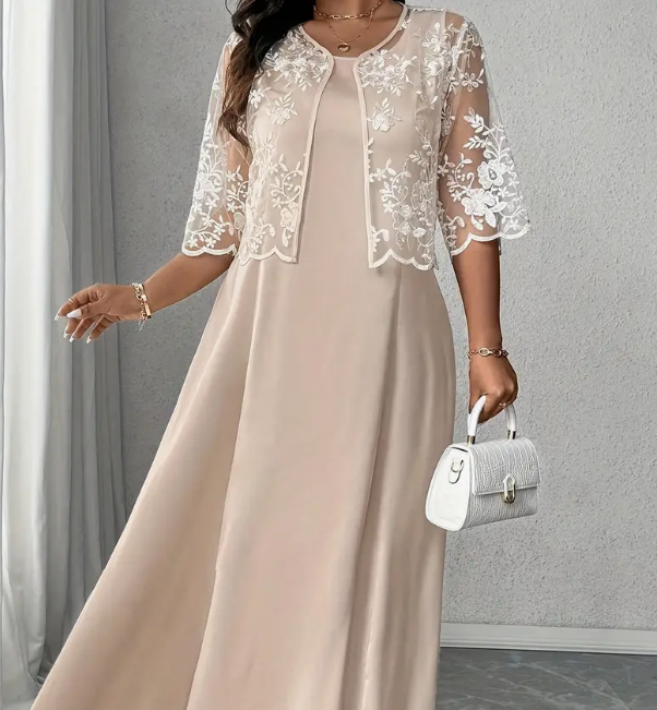 Raffinato e senza tempo, questo abito lungo con giacca in pizzo floreale è perfetto per cerimonie, matrimoni o eventi speciali.