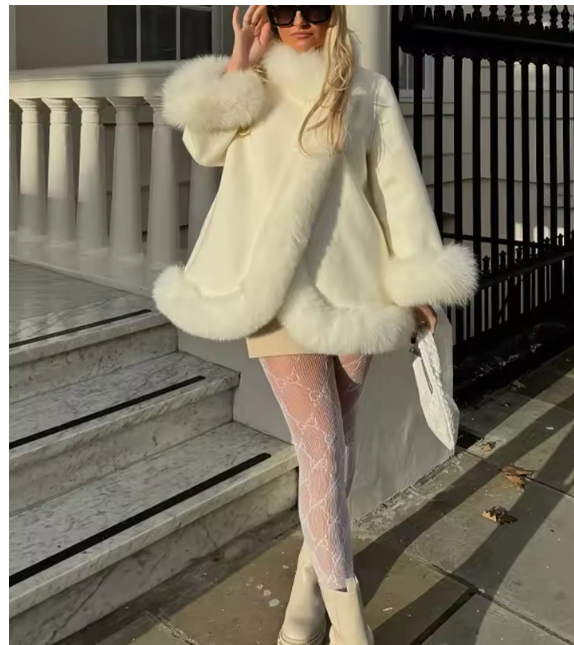 Un capo sofisticato e glamour, perfetto per chi ama distinguersi con stile. Questo cappotto color avorio è arricchito da morbidi bordi in eco-pelliccia soffice su maniche, fondo e collo, che donano un tocco lussuoso e raffinato.
