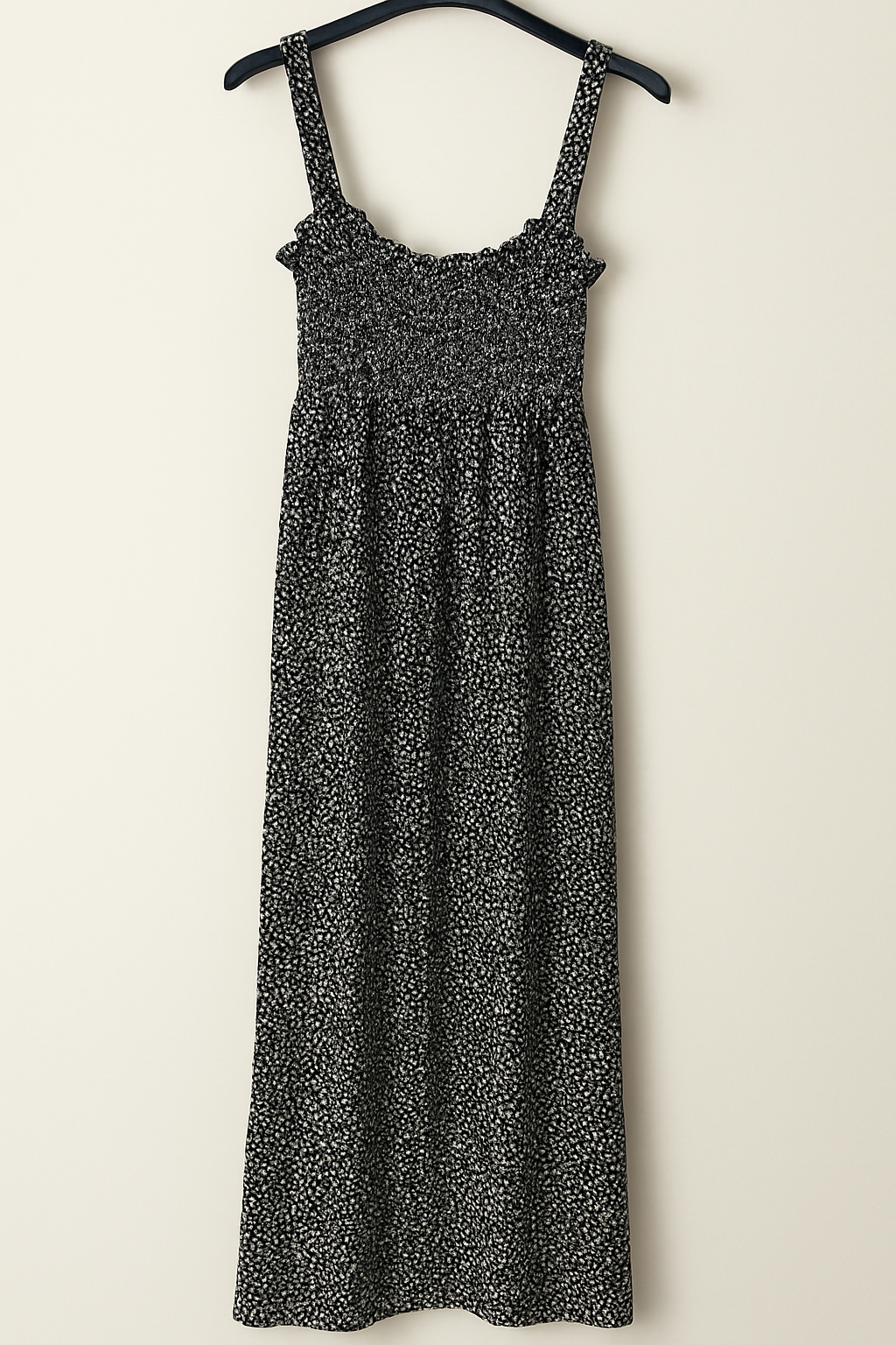 Elegante abito lungo con spalline sottili e corpetto arricciato, molto comodo e versatile.