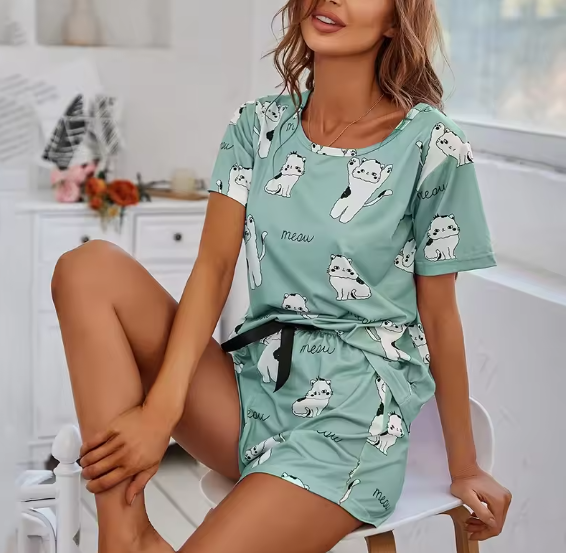 🐾 Pigiama Donna Estivo con Gattini – Completo Maglietta & Shorts Verde