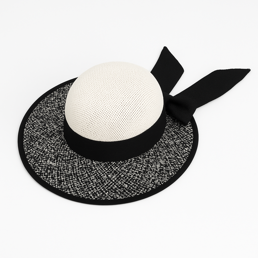 Raffinato cappello da donna, perfetto per l’estate e le occasioni speciali. Realizzato in paglia intrecciata bicolore, presenta una cupola chiara traspirante e una tesa decorata con motivo intrecciato nero e bianco. A completare il design, un nastro nero con grande fiocco laterale che dona un tocco di classe e femminilità.
