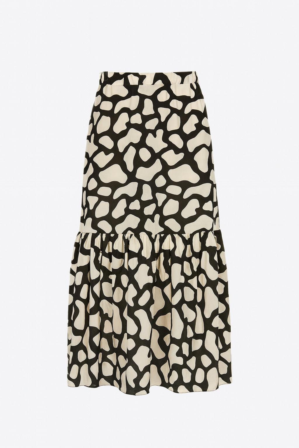 Dettagli gonna: vita elasticizzata, taglio svasato, balza inferiore con arricciatura