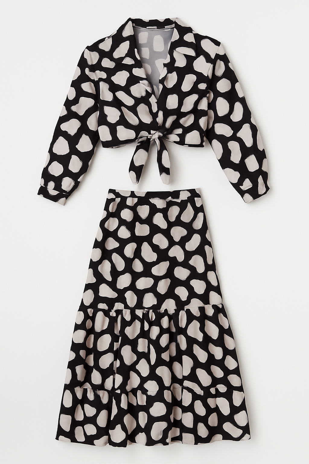 Raffinato e contemporaneo, questo completo in due pezzi è la scelta ideale per chi ama distinguersi con stile. Realizzato in tessuto leggero e fluido, presenta una camicia crop con nodo frontale e gonna midi a balze con elastico in vita, perfetta per valorizzare la silhouette in modo naturale e confortevole.