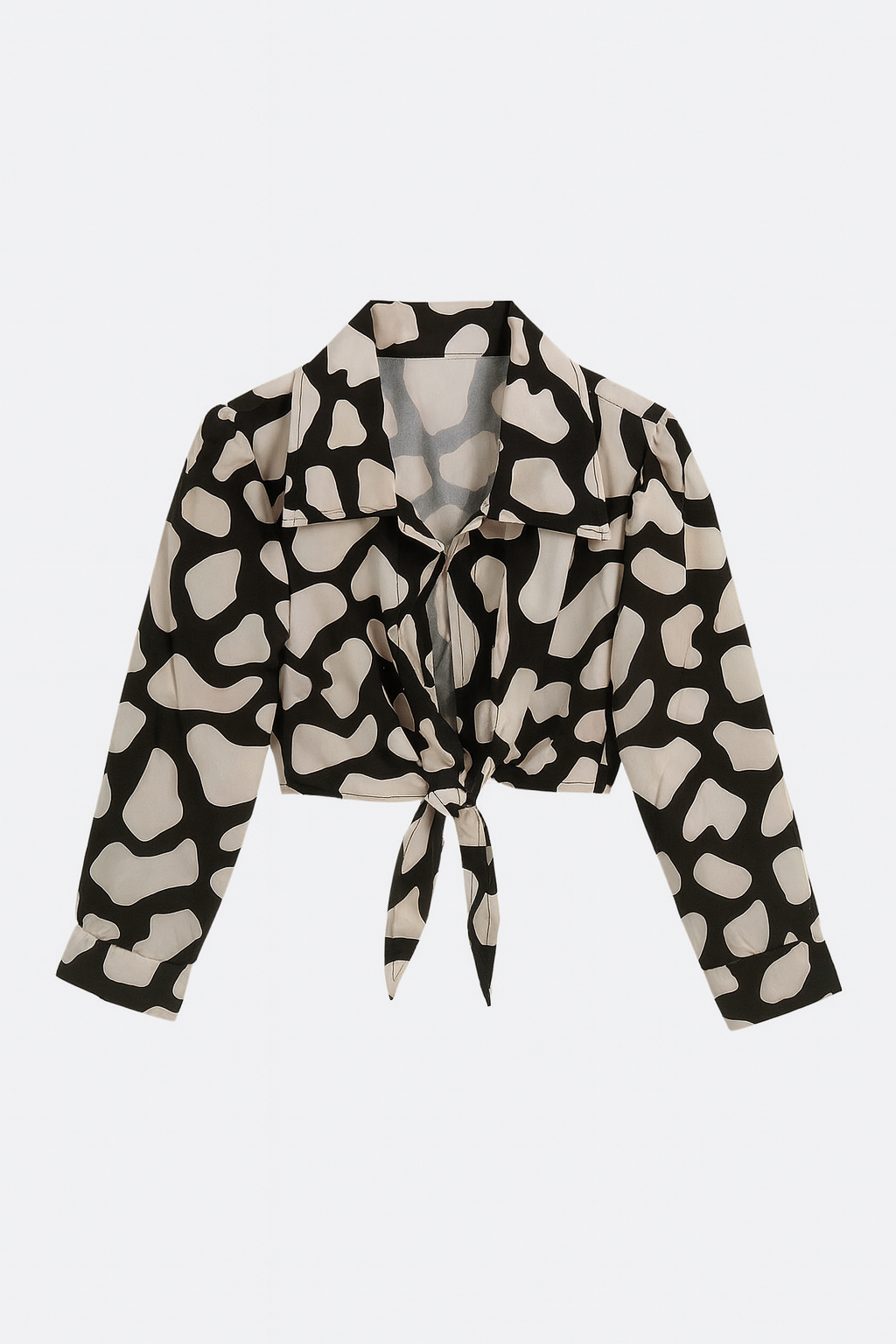 Dettagli camicia: colletto classico, maniche lunghe con polsino, chiusura frontale con nodo