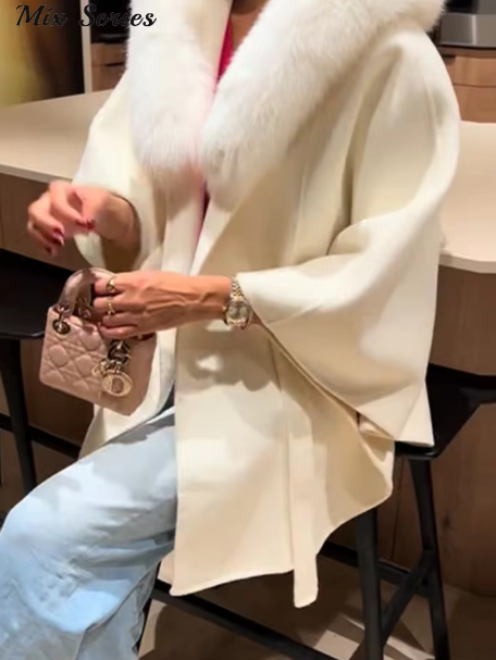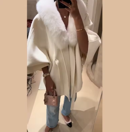 Mantella Elegante con Collo in Pelliccia Ecologica – Bianco Avorio