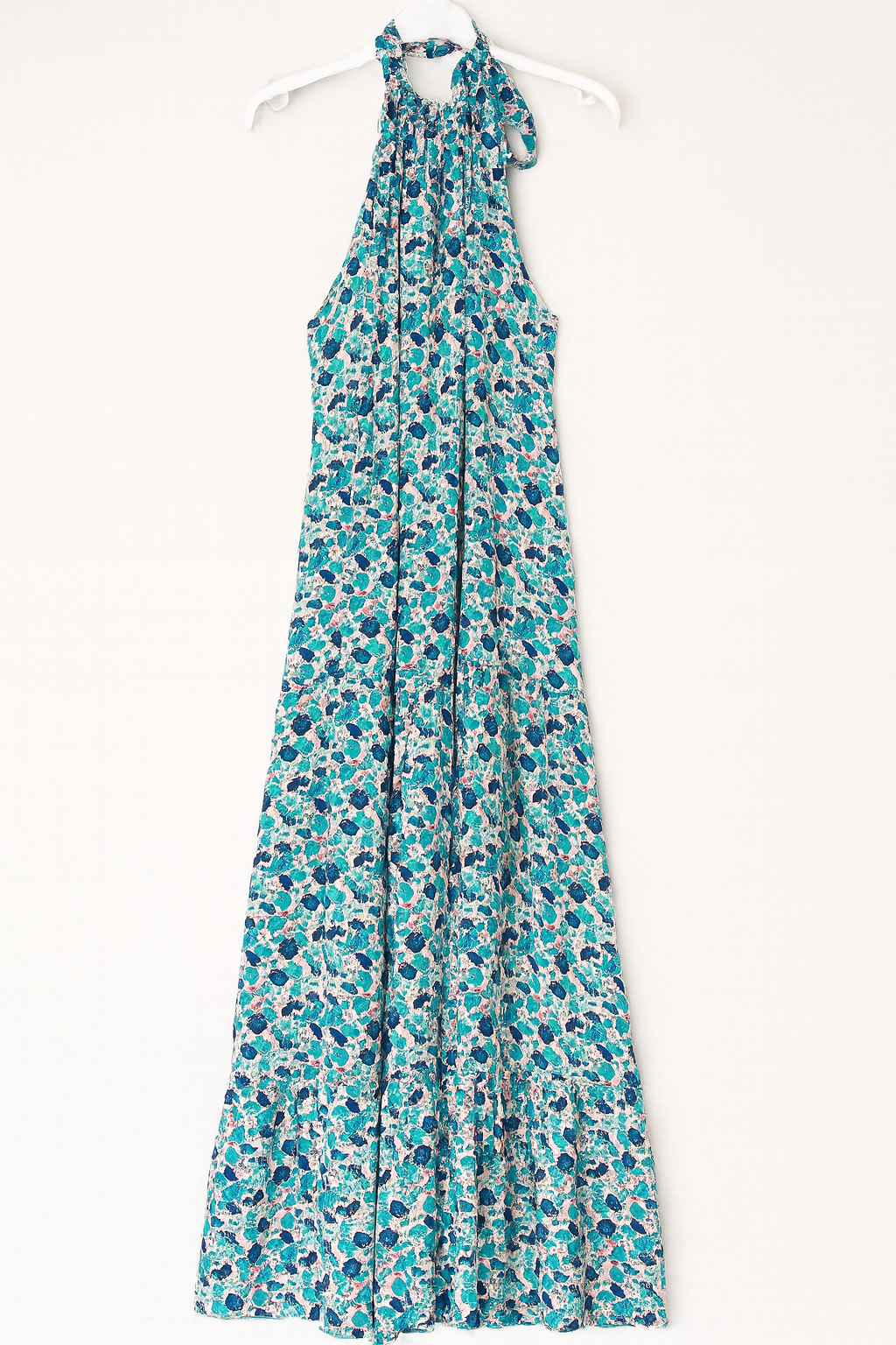Questo abito lungo è realizzato in tessuto leggero con stampa floreale nei toni del turchese, blu e rosa. Lo scollo all’americana con fiocco da annodare sul collo dona un tocco raffinato e femminile, mentre la linea morbida e svasata assicura comfort e libertà di movimento.